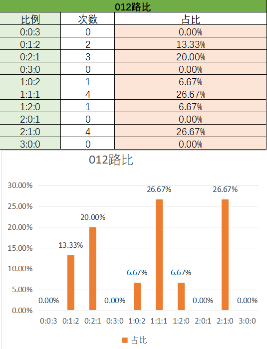 上期012路比是2:1:0各个类型占比没有变化。近15期内,2:1:0是开出最多的,次之是0:2:11:1:1,然后是0:1:2,最后是1:2:01:0:2总的看0最热门其次是1路,最后是2本期看好1:1:12:0:1