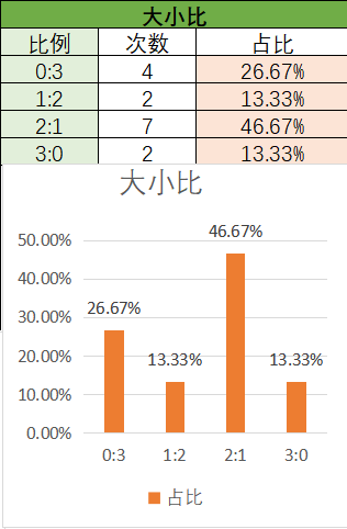 上期大小比为0:3,其中0:3占比变大,2:1占比变小。可以看到近15期内2:1优势最好的其次是0:3,最后是1:23:0。本期看好1:2开出,其次是2:1