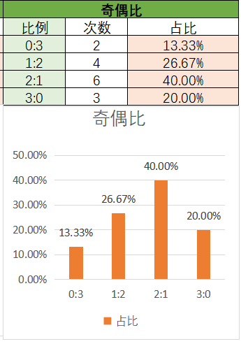 上期奇偶比为0:3,各个类型占比没有变化。近15期内1:2优势最大,次之是2:1,然后是3:0,最后是0:3上期开了0:3奇偶比,本期看好2:1奇偶比的开出,其次是1:2