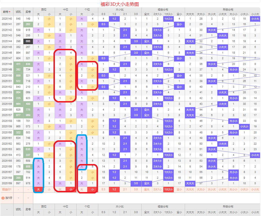 上期大小比为3:0,全大的号码组合方式,从近五期出现情况看,大号码出现9次,小号码出现6次,大号码出现较多,本期侧重两小的号码组合,本期百位侧重大号码,十位本期走小的概率很大,个位要侧重看小,侧重大小小或者小大小的号码组合,根据大小做五码定位56789/01234/01234或01234/56789/56789