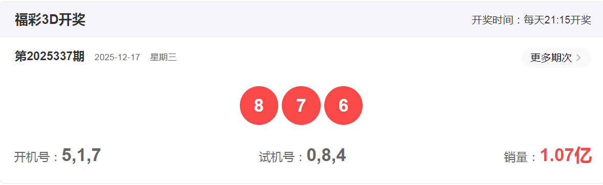 福彩3D2025年12月17日第337期开奖号码是876,顺子号码,大大大,偶奇偶,和值21,跨度2