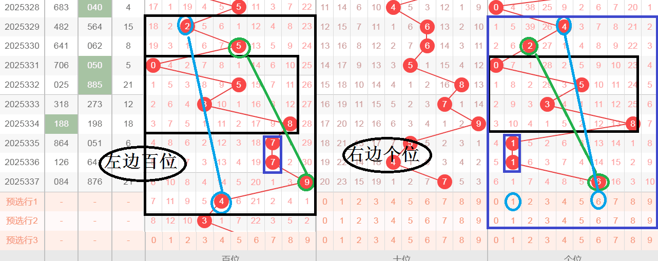 这是一张叠加图,利用百位来分析个位,为了让大家更清楚的看的到,左边是百位走势图,右边是个位分析图,在近期的百位开出 黑颜色框0538,在个位同样也出现了黑颜色框0538,在百位黑颜色的框的下期出现了蓝颜色框两个7,全奇数,在个位黑颜色框的下期出现了蓝颜色框两个1,两个蓝颜色1对称蓝颜色两个7,在百位绿颜色线条出现了5和9,5和9是两码差4,它们的方向是由小到大,在个位绿颜色线条出现了2和6,2和6也是两码差4,它们的方向也是由小到大,在百位青颜色线条出现了2和4,2和4是两码差2,2和4是两个偶数,那么轮到今天的个位,青颜色线条会不会两码差2,推荐个位6的出现,文字表达的可能不太清楚,大家可以观看上面的视频