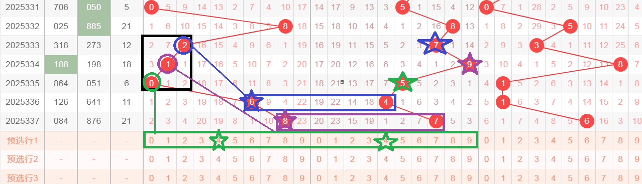 这是一张解码图,在百位出现了黑颜色框210,顺子号码,全小的等距,我们发现蓝颜色2用蓝颜色框6和4解开,因为6减4等于2,6和4是由大到小的排列,紫颜色1用紫颜色框8和7解开,因为8减7等于1,8和7也是由大到小的排列,那么轮到今天绿颜色0了,会不会两个数字相减等于0呢,那么我们来看十位星星795,795是全奇,全大,蓝颜色星7减1等于蓝颜色星6,紫颜色星9减1等于紫颜色星8,那么今天绿颜色星5减1会不会等于绿颜色星4,反过来加1的话只有6了,文字表达不太清楚,大家可以观看上面的视频