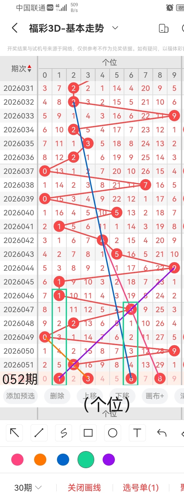 首先,为了感谢各位老板对小梁的关注和打赏,小梁特别提供一个杀个位的小技巧,同尾杀号法,准确率相还可以,但是要记住任何杀号都不能保证百分百准确的哦。小梁根据同尾杀号法,得知本期杀个位2。其次,小梁参照上图中的画线思路走势分析得出,号码1与前几期开出的号码呈斜四连的走位且呈隔五期回补的走势,跨度是1;遗落16期未出的号码3与前几期开出的号码呈斜三连的走位,跨度1;号码6与前几期开出的号码呈隔三期回补的走位且呈斜三连的走势,跨度4;遗落29期未出的号码8与前几期开出的号码呈斜三连的走位,跨度为6。综上所述,小梁参照上图中画线的思路走势论证,本期推荐个位的号码为:1、3、6、8。