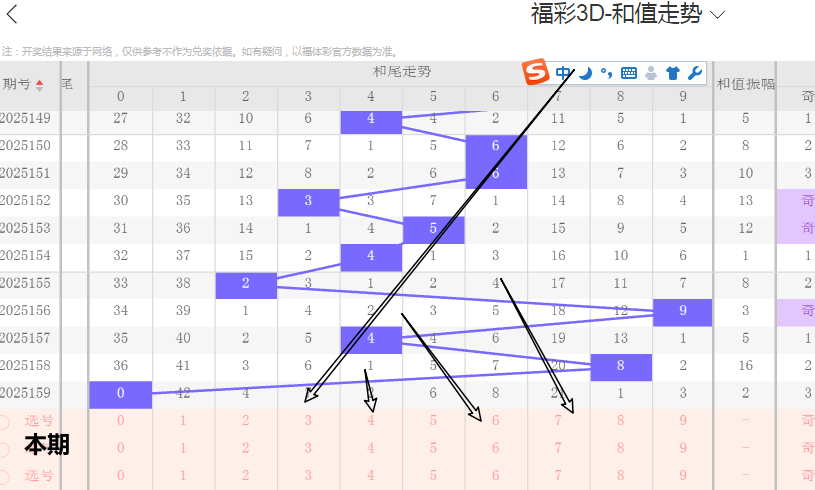 二、本期合值 012 路分析及推荐 近七期开奖号码合值为 15、14、22、19、24、8、10,对应 012 路分别为 0、2、1、1、0、2、1。 趋势观察 0 路合值(0、3、6、9)出现 2 次,1 路合值(1、4、7)出现 3 次,2 路合值(2、5、8)出现 2 次。 近三期合值路数为 0、2、1,路数分布相对较为均匀,没有明显的持续走强或走弱趋势。 推荐路数 0 路合值在历史同期可能是高频合值,本期有回补的可能性,可关注 0 路合值 0、3、6、9。 1 路合值近期表现较为稳定,也有继续出现的可能,可关注 1 路合值 1、4、7。