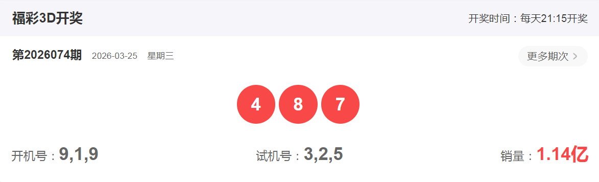 福彩3D2026年3月25日第074期开奖号码是487,组六形态,和值19,跨度4,小大大,偶偶奇