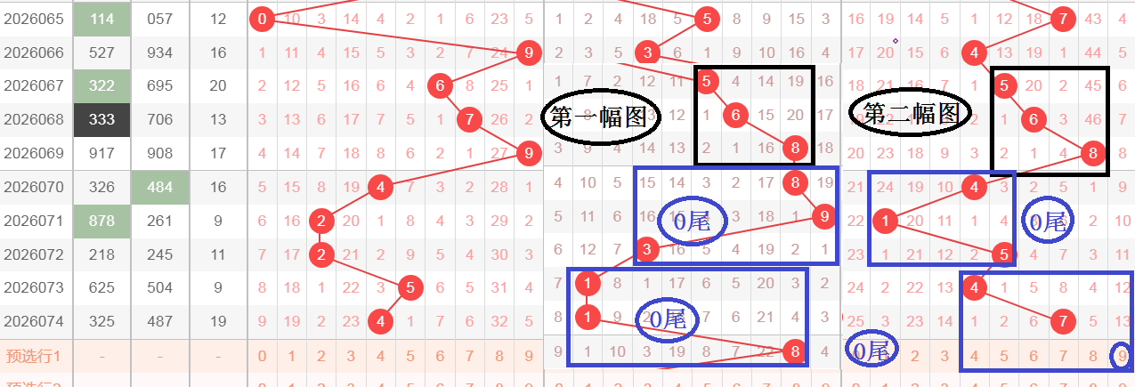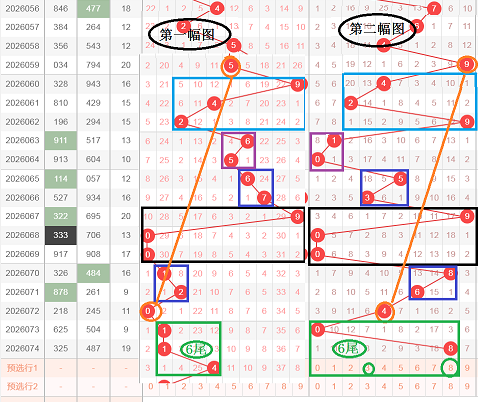 这是一张个位分析图,利用十位来分析个位,为了方便分析,我把图叠加了,分成了第一幅图和第二幅图,也就是说利用第一幅图来分析第二幅图,在第一幅图中开出了黑颜色框568,在第二幅图中同样也开出了黑颜色框568,在第一幅图中蓝颜色框开出了893,893这三个数字相加等于20,也就是0尾,紧接着第二个蓝颜色框开出了118,118这三个数字相加等于10,也是0尾,这两个蓝颜色框相加的和值尾属于对称,在第二幅图中蓝颜色框开出了415,415这三个数字相加等于10,也是0尾,那么轮到今天,个位蓝颜色框相加会不会相加等于0尾,推荐个位9,防止9的对应数4,文字表达不太清楚,大家可以观看上面的视频