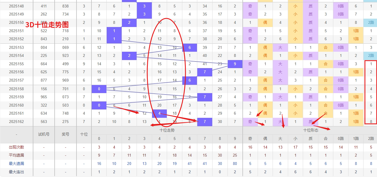 福彩3D十位分析:第2025162期十位开出号码7属大奇数号码后端。以历史100期数据为例十位奇偶比约为48比52,大小比约为55比45近期大小相差3点,根据求均衡的规律开出大数的概率比小数高一点。上期我们分析偶数经过连续回补后有走奇数的可能,开出奖号7大奇数符合我们的预期。通过对十位的振幅走势来看,上期十位走出3个振幅落位号码为大奇数号码球7,那么在对本期号码进行分析时我们可以看出近期在十位落位的号码整体振幅的跨度比较小,但基本在两三个周期就要进行一次调换,那么本期十位号码走出了落位方面我们重点考虑大号码为宜,近期3D十位走势中,数字2、3呈现温态,出号频率有所提升,有转热的迹象,可重点关注其延续性表现。而数字8已遗漏30期,冷态明显,历史最大遗漏通常在40期左右,当前接近临界点,需防范其突然回补。结合整体走势,十位近期以中小数(0-5)为主,但大数(6-9)存在回补空间,适当关注2、3的连开可能,同时防守冷号8的反弹,所以福彩3D第2025163期十位推荐35268。