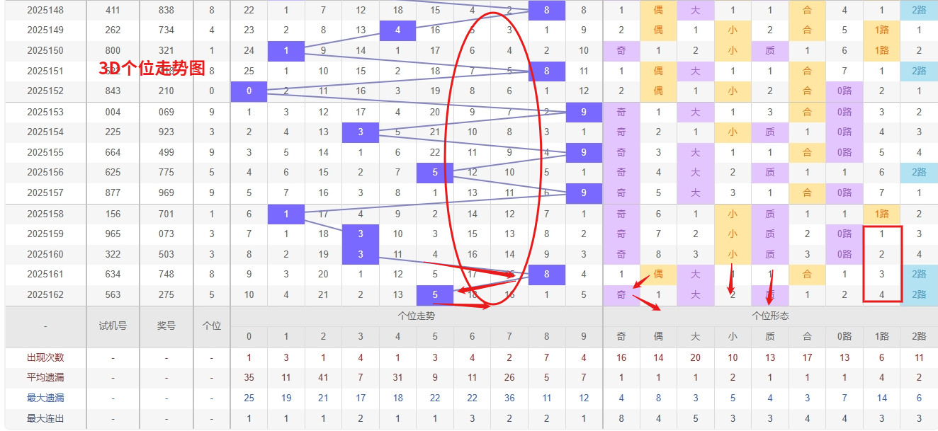 福彩3D百位分析:第2025162期百位开出号码2属于小偶数,从上面百位走势图上可以看出近100期大小比约为48:52奇偶比约为53:47。近期数据还是比较极端的符合文章开头介绍的求均衡规律非等量现象。但这种均衡不会持续最终会被偏态运行打破,然后循环往复。但短期内大小相差5点,大数过热小数有回补需求本期个人认为走小数的概率更高。上期百位落号“2”号球,在百位号码开出2路号码2后向小数方向走出5个振幅。那么通过分析上期百位落位号码分析,号码走出5个振幅,号码走为小偶数,开出2路号码2。通过对百位落号趋势来分析,百位号码落位前端,通过对近10期的走势来看百位号码大小交替频繁走3期大数又走2小数,最近小数比较强势,本期有继续走向小数号码的概率。那么本期我们在对百位号码进行分析时我个人的考虑百位号码会走出小数号码球,近期3D百位走势中,数字0、1、3表现偏冷,遗漏值持续走高,需重点防范回补。从历史数据看,冷号往往在阶段性沉寂后迎来反弹,尤其是百位近期热点集中于中大数(4-9),0、1、3作为小数区域的关键数字,存在较强的技术性回调需求。结合跨度、奇偶等形态进行组合防守,可适当关注0与1的对称出号规律及3的同周期斜连现象,我们在百位关注的重点在01369这5个号码球上,百位号码近期奇偶切换频繁,2号球码属于2路号码偶数,现偶数开出过多有向奇数的趋势。所以福彩3D第2025163期百位看01369。