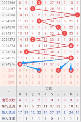 现在我给大家分析下,本期百位可能开出的号吗,上期开出了0,264期开出了7号码球,265期开出了2号码球,266期开出了3号码球,267期开出了2号码球,268期开出了9号码球,269期开出了3号码球,270期开出了6号码球,271期开出了7号码球,272期开出了2号码球,273期开出了8号码球,274期开出了1号码球,275期开出了8号码球,276期开出了0号码球,根据这六期的走势和历史50期内的走势对比,我们可以先考虑本期可能会出大号,下面我给大家推存百位可能开出的几个号,个人比较看好368,百位我们就先暂定这两个号。本期重点关注3-7之间的号码,同时关注遗漏期数较小的号码。按最近遗漏走势,开了遗漏期数较小之后开遗漏期数大的可能性比较大。