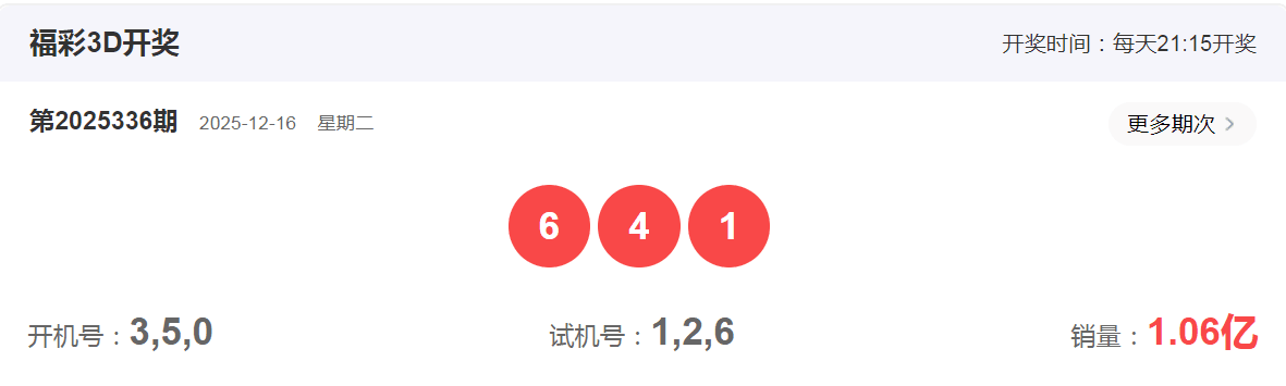 福彩3D2025年12月16日第336期开奖号码是641,和值11,跨度5,大小小,偶偶奇
