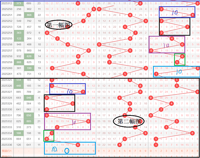 昨天家里有事,没有和大家分析走势,在这里说一声抱歉,这是一张叠加图,利用个位来分析百位,为了和大家更方便的看的,我把叠加图分成了两个部分,分别用第一幅图和第二幅图来分析,今天用到的是图像,也就是说对应数三角形,在第一幅图中开出了黑颜色框272,2和7是对应数,在第二幅图中开出了黑颜色框050,0和5是对应数,在第一幅图中蓝颜色框开出了2和8,两个数字相差等于6,它们的方向是由小到大,在图中蓝颜色框笔误,写成了10,在第二幅图中蓝颜色框开出了1和7,1和7也是两码差6,它们的方向也是由小到大,在第一幅图中在颜色框中开出了460,这三个数字全部都是偶数,三个数字相加等于10,在第二幅图中在颜色框开出了082,这三个数字也是全部都是偶数,这三个数字相加也等于10,在第一幅图中绿颜色框开出了6和5,两个数字相差等于1,它们的方向是由大到小,在第二幅图中绿颜色框开出1和0,这两个数字相差也等于1,它们的方向也是由大到小,轮到今天,第一幅图中的青颜色框开出了9和1,这两个数字是补数,也是两个奇数,方向是由大到小,那么今天的百位青颜色框先开出了一个6,6的补数是4,推荐百位4的出现,文字表达的可能不太清楚,大家可以观看上面的视频