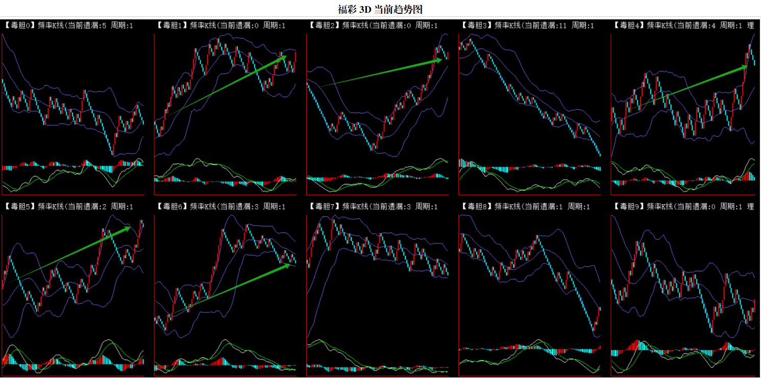 整体趋势上行,上边沿线趋势向上,下边沿趋势也是向上,节点震荡,当前遗漏3期,本期关注。