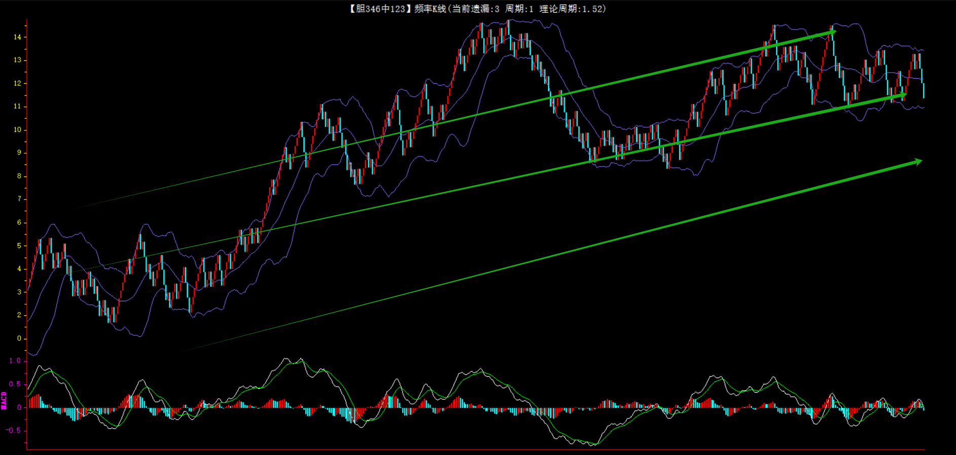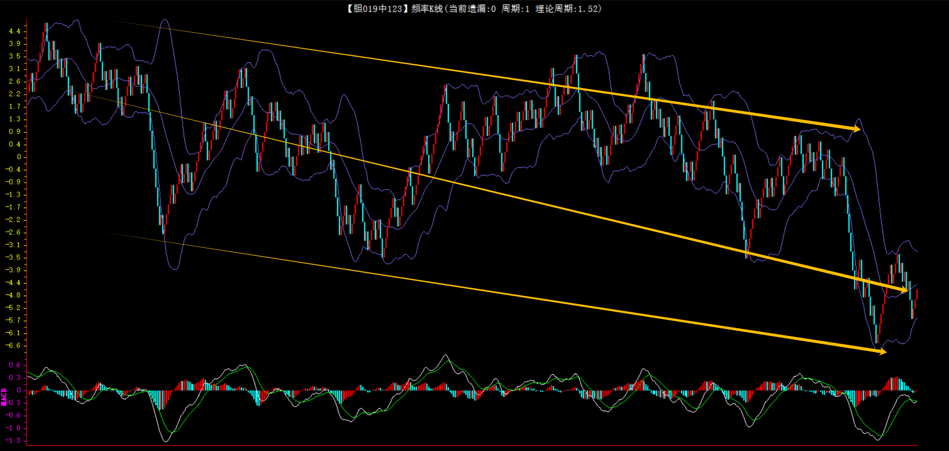 整体趋势下行,上边沿线趋势向下,下边沿趋势也是向下,节点震荡,当前连开3期,本期防守。