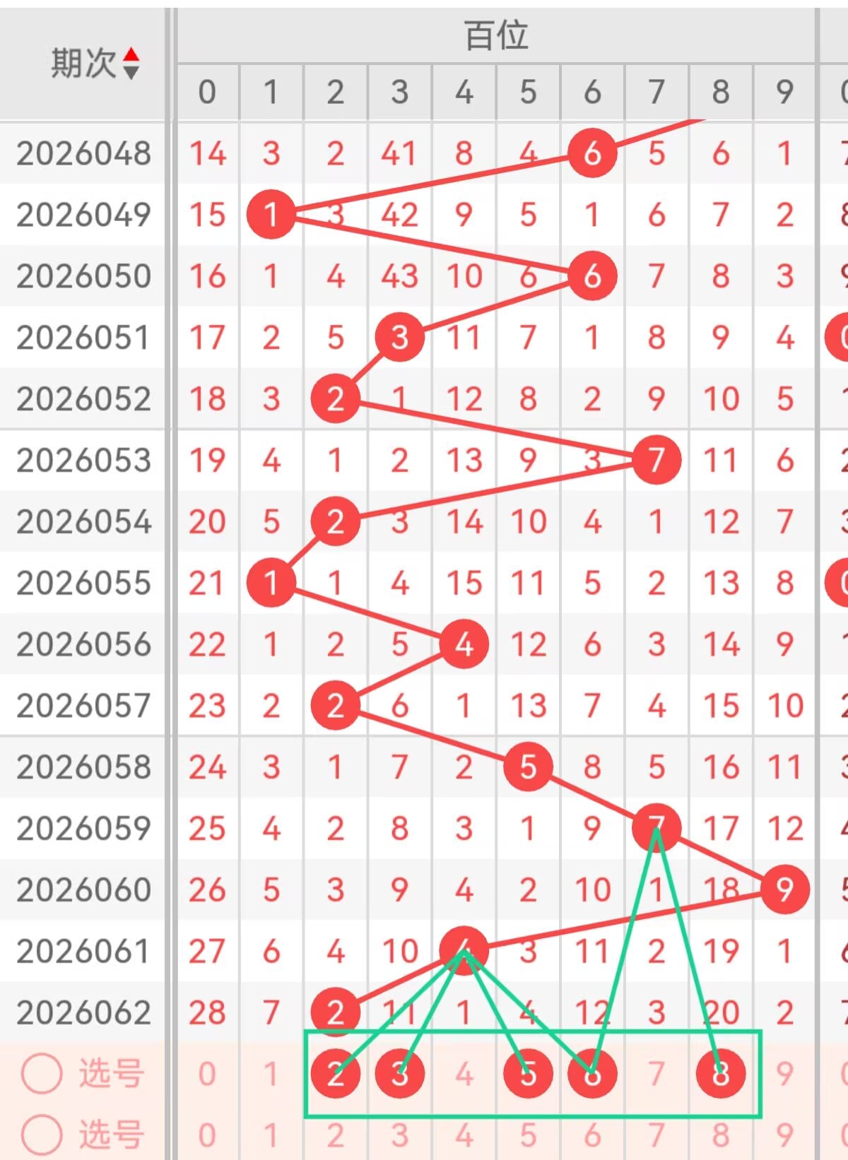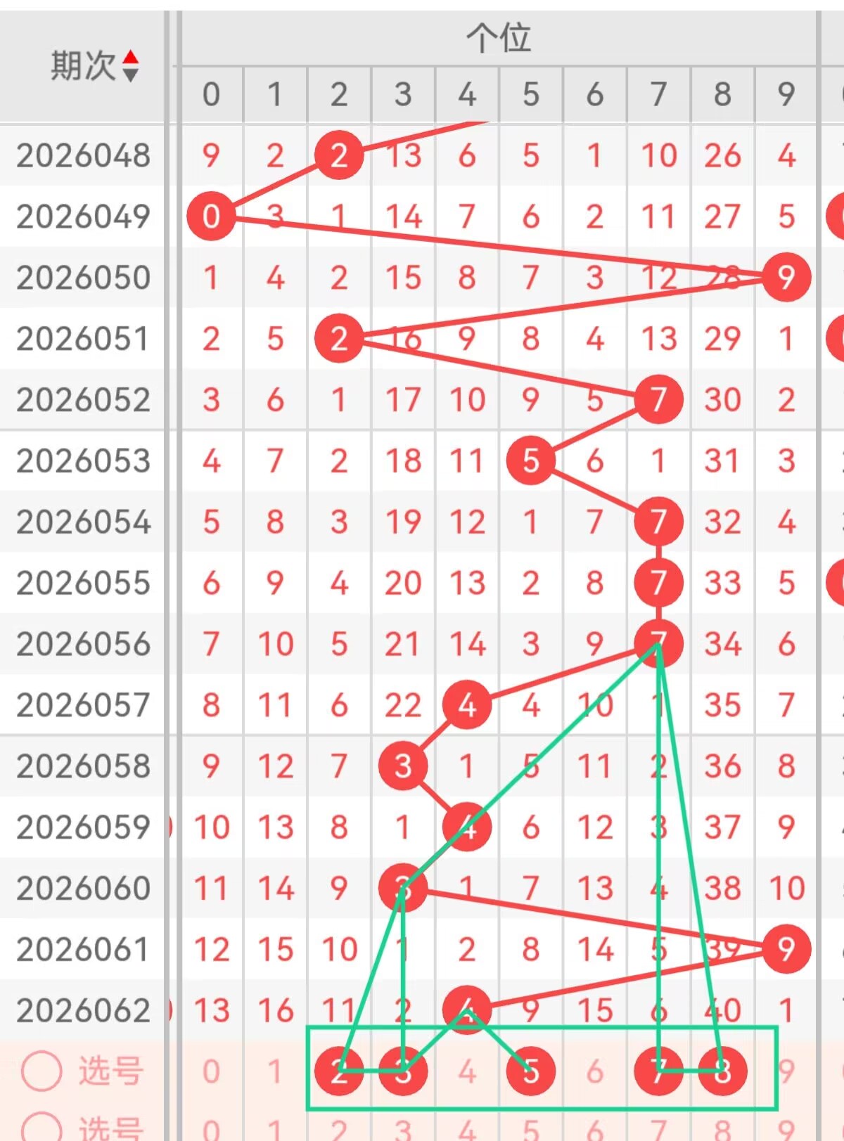 上期个位开出4,重点看好3、5、7三个号码,备用选择2、8。号码3为质数小号,遗漏2期,在4开出后历史跟随概率极高,同时1路属性契合近期路数轮换节奏;号码5是质数中大号,遗漏9期,近30期热度稳定;号码7为质数大号,遗漏6期,近10期出现频次居高不下,延续性高。备用号码2遗漏11期,偶数温号,可平衡整体奇偶比例;号码8遗漏40期,这个号码遗漏次数太大,本期该回补开出来了。
