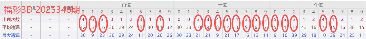 2025346期开奖号码897,我们可以看出近30期百位8出现4次,十位9出现4次,个位7出现2次。
