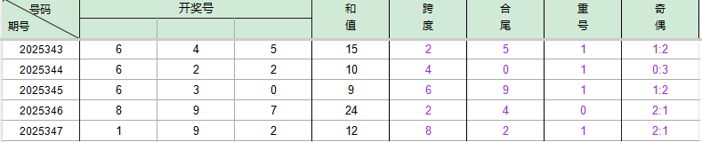 2025343期开奖号码645,我们可以看出近30期百位6出现6次(减位回补),十位4出现4次,个位5出现4次(较346期减一)。