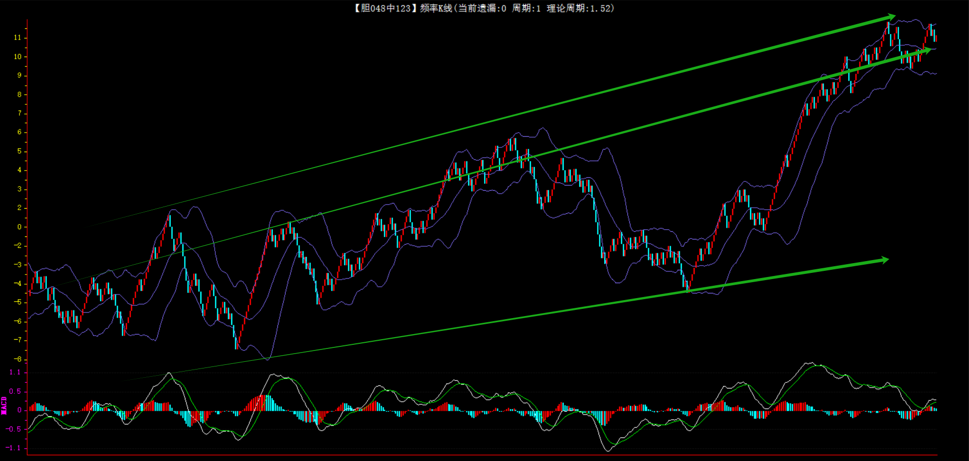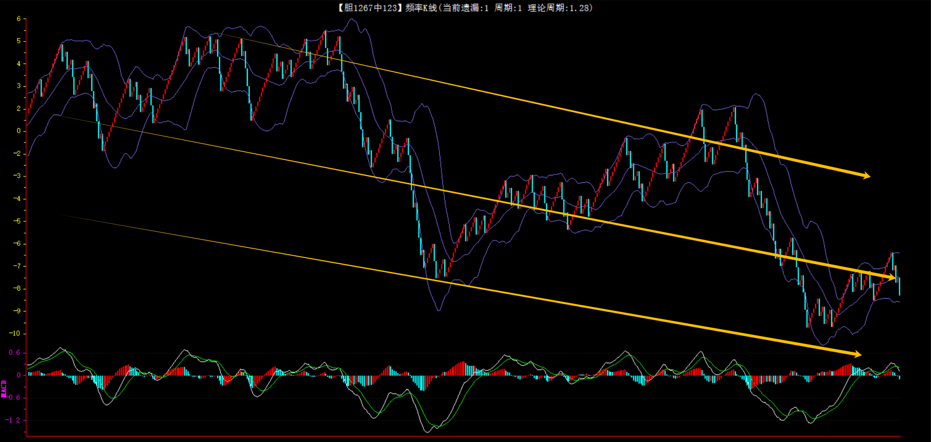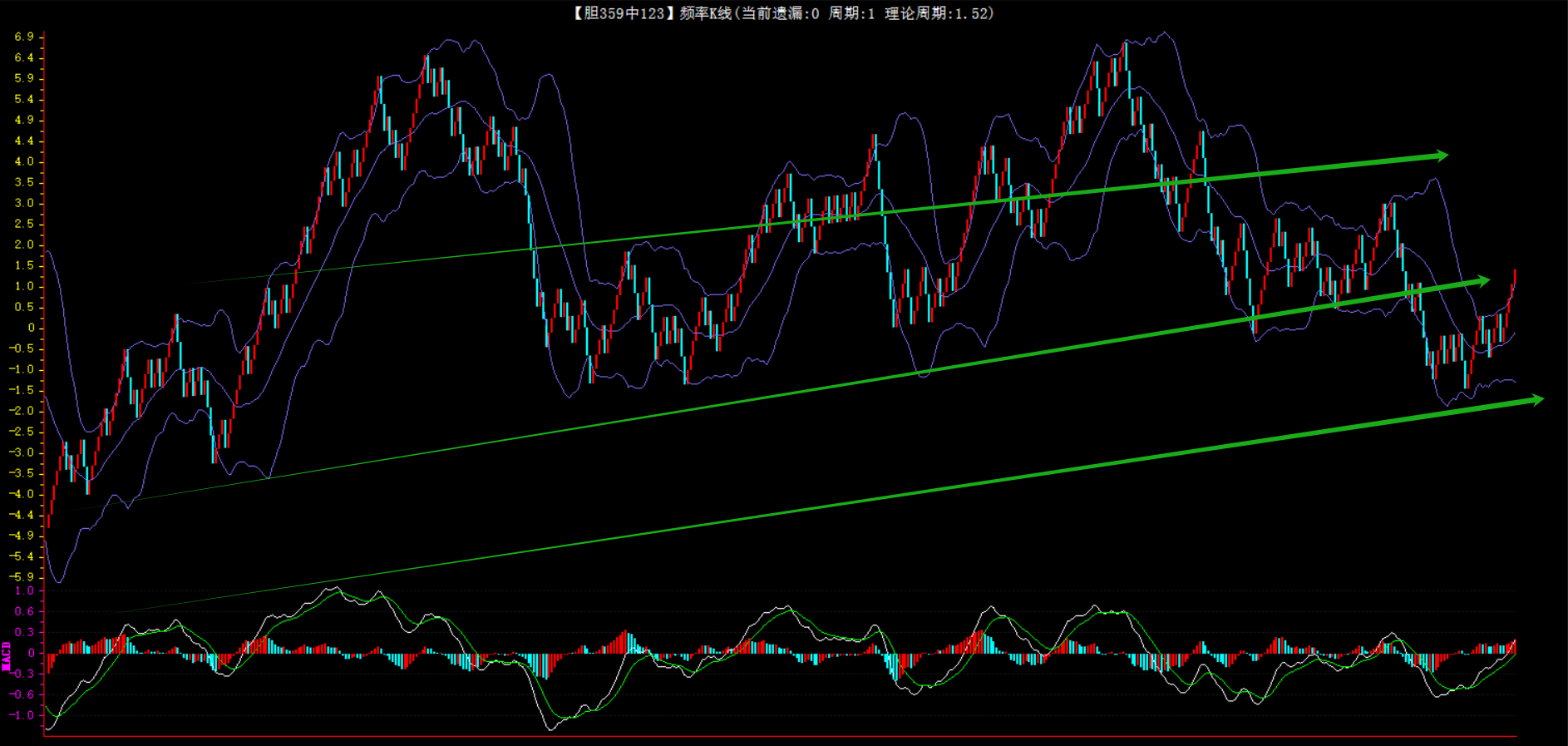 整体趋势下行,上边沿线趋势向下,下边沿趋势也是向下,节点震荡,当前遗漏1期,本期防守。