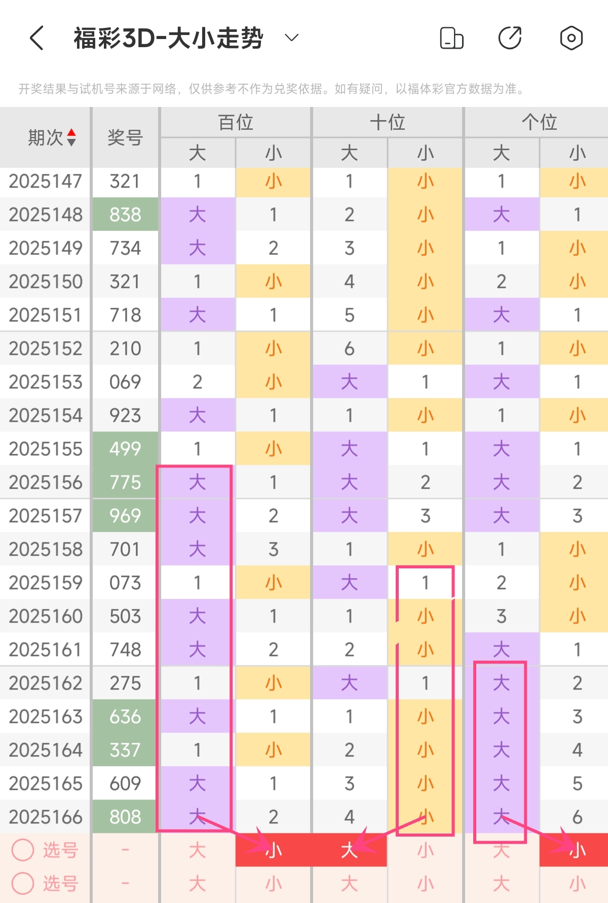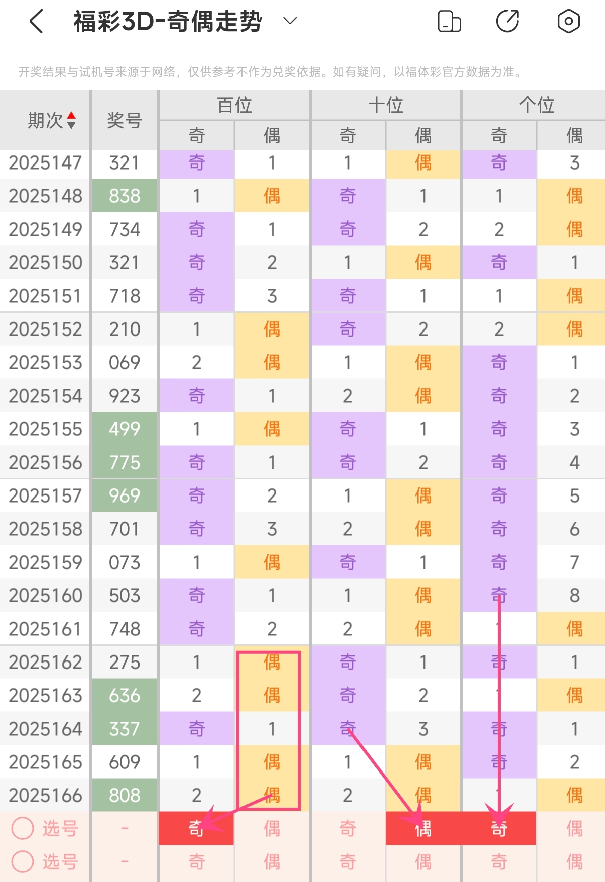 首先让我们回顾一下上期福彩3D第2025166期开奖号码为808,为组三形态,大小比为2:1,奇偶比为0:3,和值为16,跨度为8。