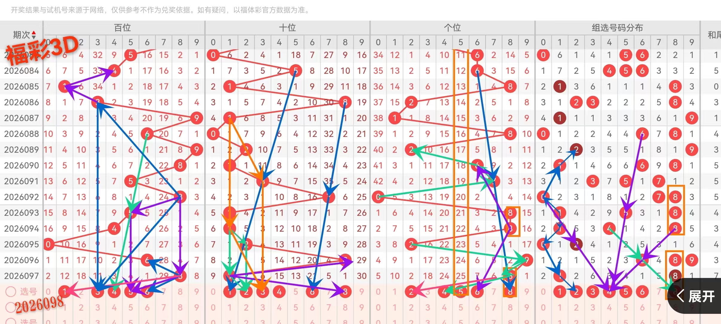 百位近期走势:上期开出8,是个大数。个人看法百位出了四期偶数走68开大,极有可能向中小号区域寻找支撑。1、3、4偏向于小和温,如果百位想往下走,它们是首选;5和6则带有明显的防守开出,你要注意,这五个数字里,1、3比较有大概率适合快进快出小单;4、5、6是防守。具体怎么选,得看你当时对整体和值与跨度的感觉。如果追求小和值,百位就得从1、3里出;如果想拉大跨度,1配6或者3配6就不错。看号配号就是一种博弈,综合上述分析百位推荐:13456