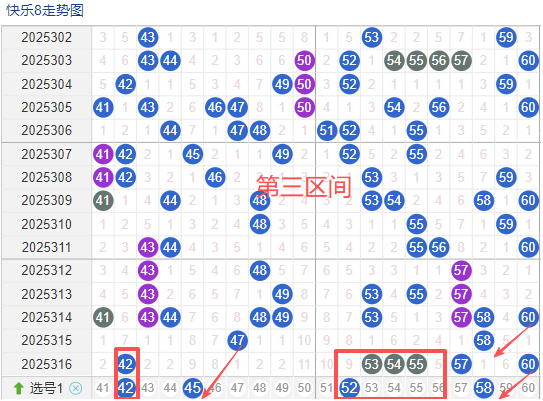 三区间开出了6个奖号(42.54.53.55.57.60)上期回顾三区开出6个奖号上期的三区间的奖号数量呈现一个递增的形态,4头回补1个,本期先来看号码45近期出现频率相对来说还是很稳定。偶尔有时间隔期数也是很长,说明其在近期的开奖中较热的,号码42在近 30 期内出现次数相对是稳定的号码,近期的活跃度也是较。号码52有一定的间歇性,通常间隔5-3期会出现一次,没有明显的连续出现态势,走势相对较,在整个第三区间的表现本期还是可以防守的。号码58走势相对近期较,近期没有连续间隔落号的情况,活跃度近期处于较稳定状态注意防守。
