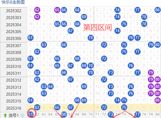 上期四区间开出了5奖号(62.65.67.72.75)上期的四区开5个奖号呈现了一个递减的趋势,开出的奖号7头回补2个,6头开也是回补了3个,先来看号码61在近 30 期内属于是一般的号码,近期出现频率相对还是比较好一点,偶尔会间隔多期后出现一次,这个号码要注意防守,号码66具有一定的间歇性活跃度较热比如有时会间隔 3到4期就再次出现,也有时会间隔多期,近期整体出现频率比较热,近期还是要关注的.号码77活跃度近期比较,有一定的间歇性。活跃度近期算稳定,整体走势有一定的波动性.