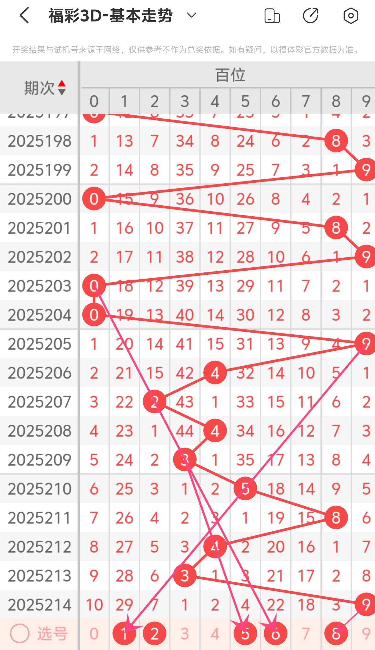 上期百位开出9,本区与上期的跨度为6,本期我们可以从上面走势图中看出选号的思路,1为斜连走势跨度为八,5为斜连走势跨度为四,6为斜连走势,8为分边走势跨一,综合以上分析,本期百位推荐:12568