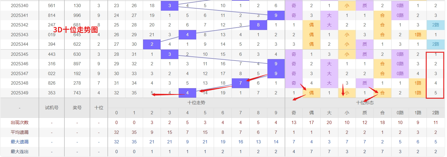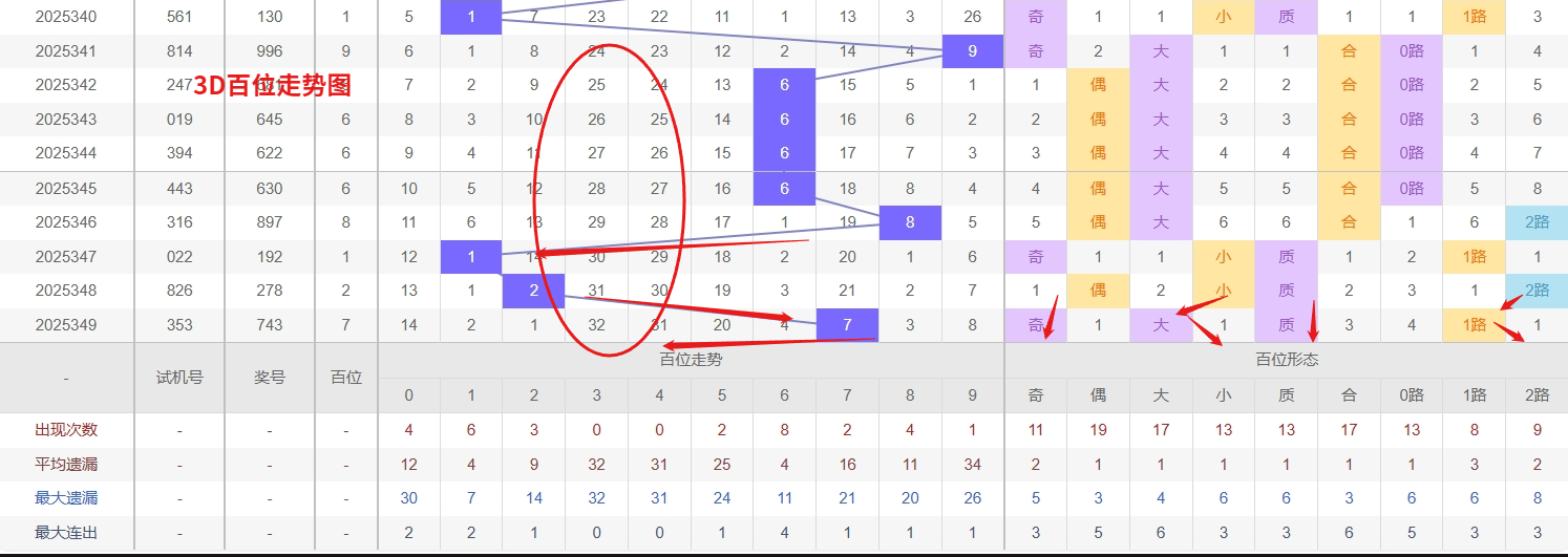 福彩3D百位分析:第2025349期百位开出号码7属于大奇数,从上面百位走势图上可以看出近100期大小比约为48:52奇偶比约为51:49。近期数据还是比较极端的符合文章开头介绍的求均衡规律非等量现象。但这种均衡不会持续最终会被偏态运行打破,然后循环往复。但短期内大小相差5点,小数过热大数有回补需求本期个人认为走大数的概率更高。上期百位落号“7”号球,在百位号码开出1路号码7后向大数方向走出5个振幅。那么通过分析上期百位落位号码分析,号码走出5个振幅,号码走为大奇数,开出1路号码7。通过对百位落号趋势来分析,百位号码落位后端,通过对近10期的走势来看百位号码大小交替频繁走2期大数又走3小数,当前3D百位走势来看,数字3与4已分别遗漏32期和31期,双双进入深度冷态,这种长期遗漏使得它们在概率上积累了较强的回补势能,尤其值得注意的是,相邻冷号往往容易形成冷态联动区,一旦百位走势向中小号区间调整,3或4的解冻反弹将成为值得重点关注的信号。与此同时,数字0却呈现出截然不同的热度,近期表现活跃,频繁开出,显示出较强的延续性,在冷号回补的预期下,热号0的惯性走势仍不可忽视,我们在百位关注的重点在03459这5个号码球上,百位号码近期奇偶切换频繁,7号球码属于1路号码奇数,现奇数开出过多有继续向奇数的趋势。所以福彩3D第2025350期百位看03459。本文由一起彩钱是生命动力所著,请勿转载