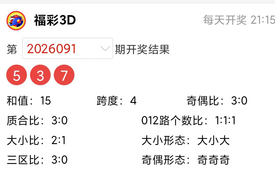 福彩3D上期(2026091期)开奖号码详情