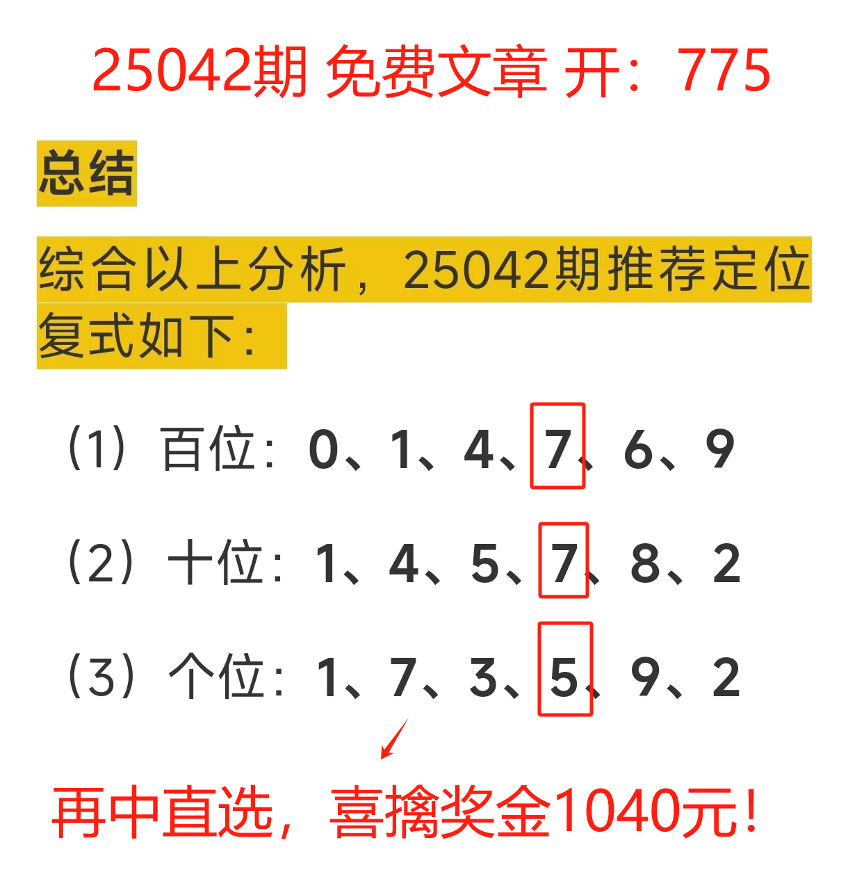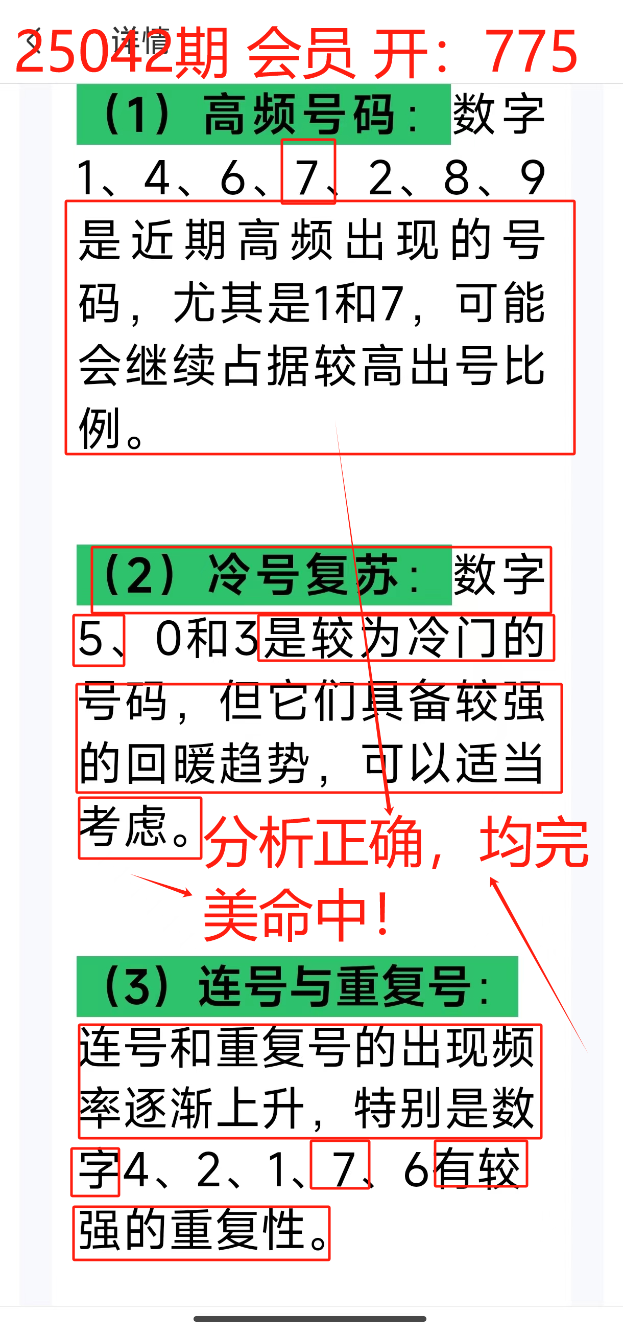 上期开奖号码为775,我们的推荐分析再次取得了优异成绩,快来一起回顾一下: