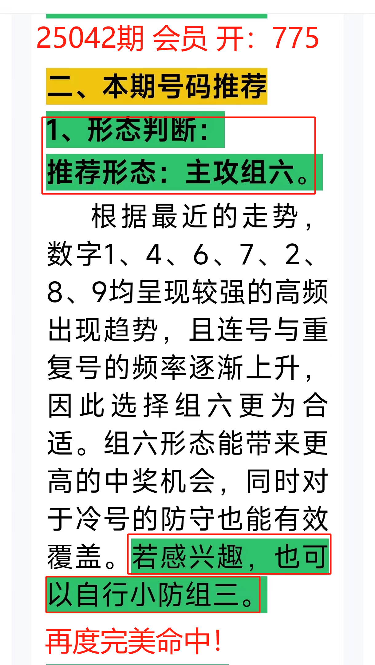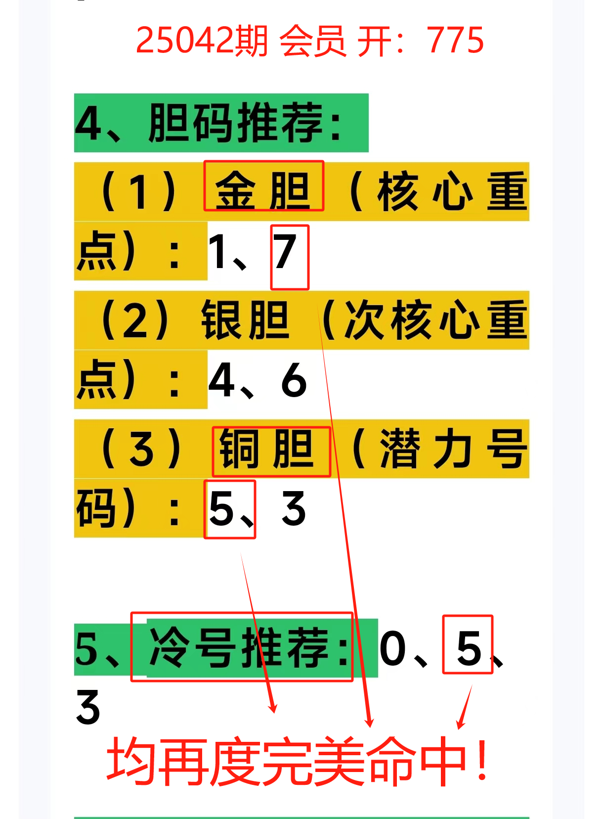 2、会员文章中,重点推荐的高频热号7、冷号5、重复号7、金胆7、银胆5,以及形态主攻组六的小防组三策略,全部命中!