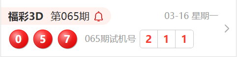 福彩3D第065期开奖结果为:057