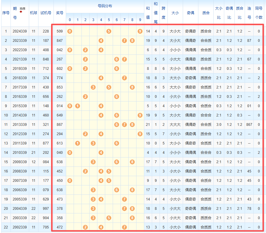 1、统计往年同期开奖号码