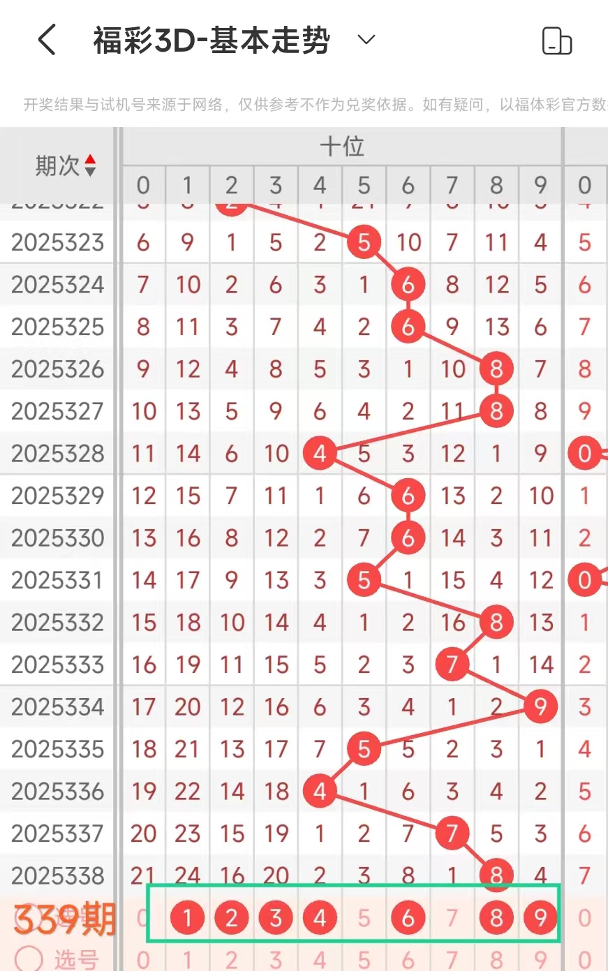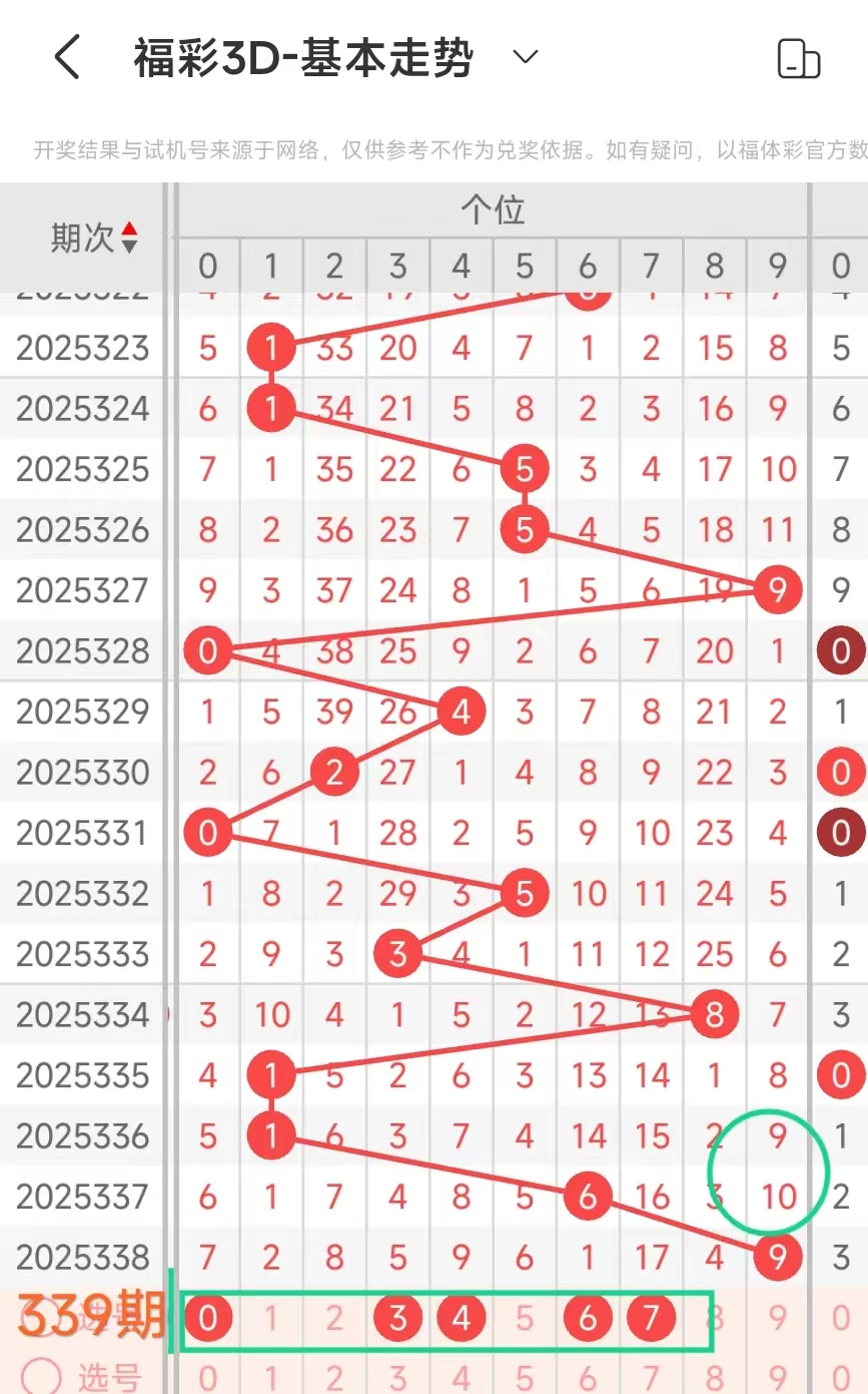 3、当个位开出9后下期开出:01420450,经统计0号出3次、1号出现1次、2号出现1次、3号出现0次、4号出现2次、5号出现1次、6号出现0次、7号出现0次、8号出现0次、9号出现0次。观察发现04号出现多次趋势好,本期可以考虑。