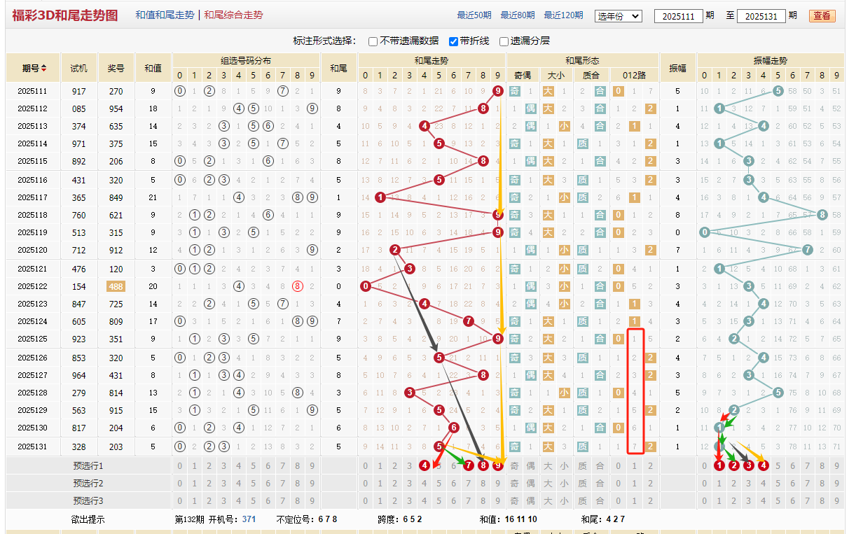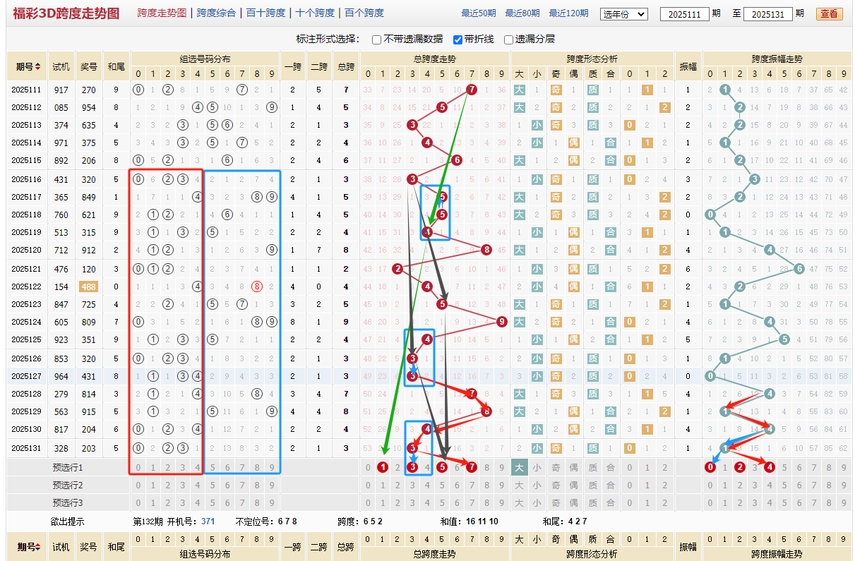 近期跨度振幅开出对称形 875 346 355 482 459 433 784 3,走两期小跨度本期考虑大跨,本期重点关注024振幅,从012路和振幅来看01路17跨更好,本期推荐7531。
