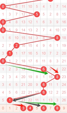 上图是福彩3D走势分布图中的百位走势图,我在上面图中标注的数字是我觉得可以关注的,数字3和数字4因为看红色箭头,上面6走8这里跨度2,那么上期1可以同样走跨度2,那么就可以关注跨度2附近的跨度就是关注数字3和数字4。数字6是因为看黑色箭头,因为上面出现了6走8再走6这里两个相同的跨度,那么这里可以关注继续走两个相同的跨度,所以关注数字6。数字8看绿色箭头,上面0走6是跨度6,这里可以看1走8跨度7。