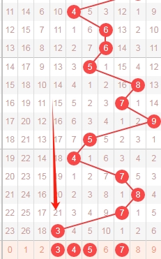 上图是福彩3D走势分布图中的十位走势图,我在上面图中标注的数字是我觉得可以关注的,因为上期十位开出数字3的遗漏周期是21期,大遗漏周期,本期关注遗漏周期的小的数字关注3 4 5 7。