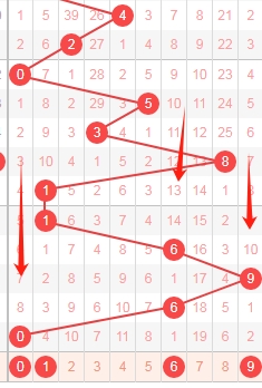 上图是福彩3D走势分布图中的个位走势图,我在上面图中标注的数字是我觉得可以关注的。跟上面十位数字的分析思路一样,本期个位数字关注遗漏周期小的数字0 1 6 9。