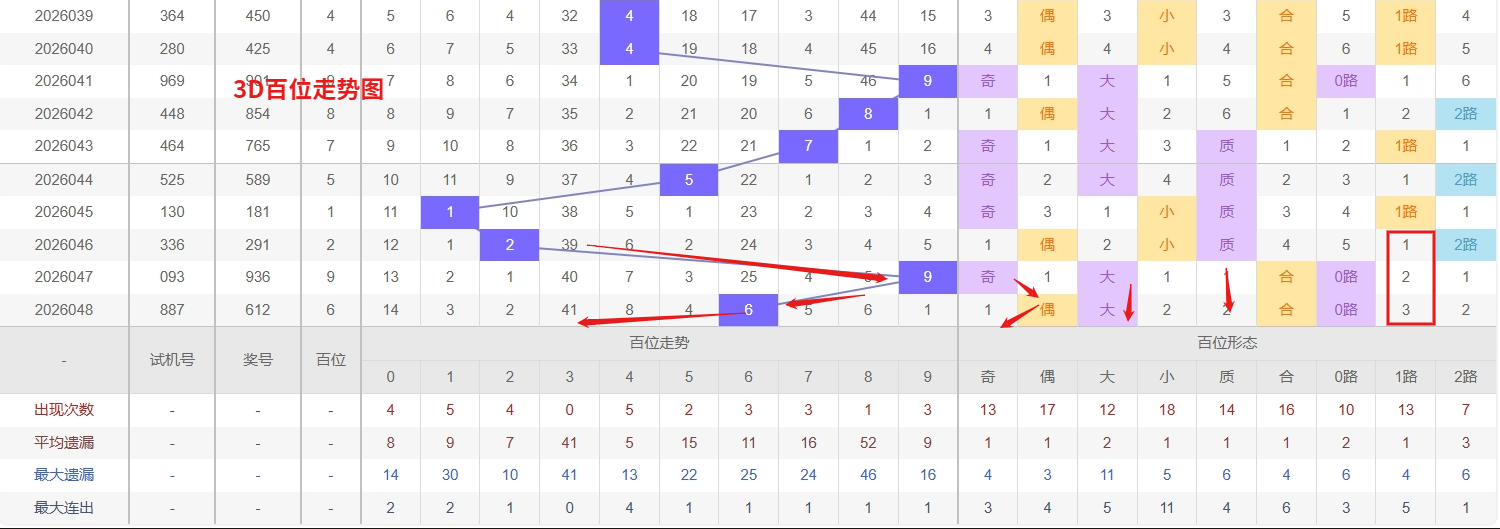 福彩3D百位分析:第2026047期百位开出号码6属于大偶数,从上面百位走势图上可以看出近100期大小比约为48:52奇偶比约为55:45。近期数据还是比较极端的符合文章开头介绍的求均衡规律非等量现象。但这种均衡不会持续最终会被偏态运行打破,然后循环往复。但短期内大小相差3点,小数过热大数有回补需求本期个人认为走大数的概率更高。上期百位落号“6”号球,在百位号码开出0路号码6后向小数方向走出3个振幅。那么通过分析上期百位落位号码分析,号码走出3个振幅,号码走为大偶数,开出0路号码6。通过对百位落号趋势来分析,百位号码落位中端,通过对近10期的走势来看百位号码大小交替频繁走3期大数又走2小数,近期3D百位走势来看,0作为当前热号表现相当活跃,近期开出频率明显偏高,且在走势图上形成连续或间隔极短的密集分布,这种热力聚集往往意味着0号正处于强势周期,热度惯性作用下,接下来仍有较大概率继续现身,尤其是在和值或奇偶形态配合的情况下,0号极易再次出现,值得重点关注;与此同时,3则处于明显的深度冷态,目前遗漏期数已远超历史平均间隔,从概率平衡和回补需求分析,冷号3的蓄力已经相当充分,随时可能在百位位置上破冷而出,特别是在热号0经历一轮连开后,往往容易引发冷热交替的走势突变,3号作为深度冷号,其回补需求正在持续累积。我们在百位关注的重点在02389这5个号码球上,百位号码近期奇偶切换频繁,6号球码属于0路号码偶数,现偶数开出过多有继续向偶数的趋势。所以福彩3D第2026049期百位看02389