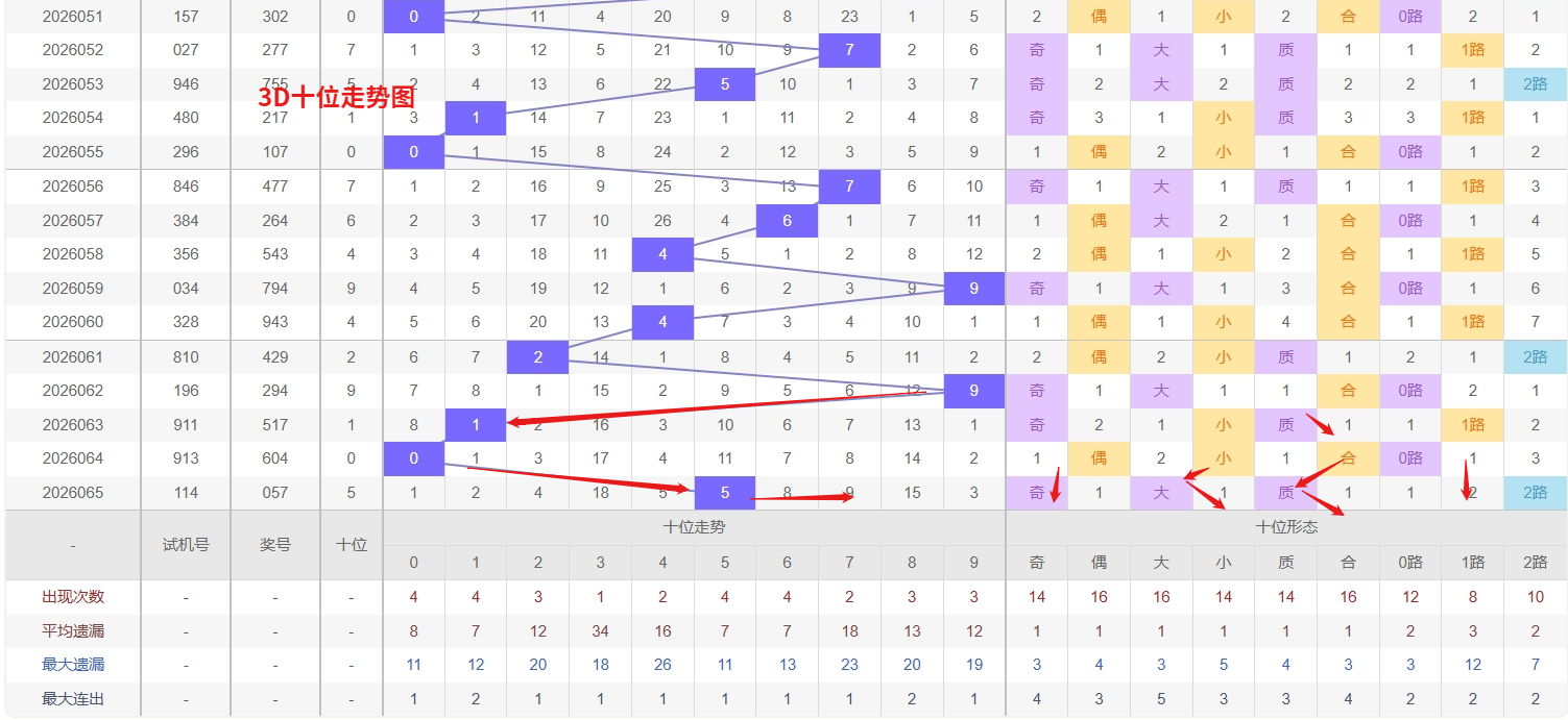 福彩3D十位分析:第2026065期十位开出号码5属大奇数号码中端。以历史100期数据为例十位奇偶比约为48比52,大小比约为54比46近期大小相差5点,根据求均衡的规律开出大数的概率比小数高一点。上期我们分析偶数经过连续回补后有走奇数的可能,开出奖号5大奇数符合我们的预期,3D十位近期的走势来看,冷热号码的分布已经呈现出较为明显的结构性机会,值得我们深入拆解。首先,冷号方面,3和4目前都处于深度遗漏状态,尤其是3号,已经连续缺席了相当长的时间,从概率回归的角度来看,这种长期未出的号码往往积蓄了较强的反弹动能,理论上已经进入了回补的观察窗口期。4号虽然也属于冷号行列,但它的遗漏周期相对短一些,可能比3号更早迎来触底反弹的契机,所以福彩3D第2026066期十位推荐13678。本文由一起彩钱是生命动力所著,请勿转载