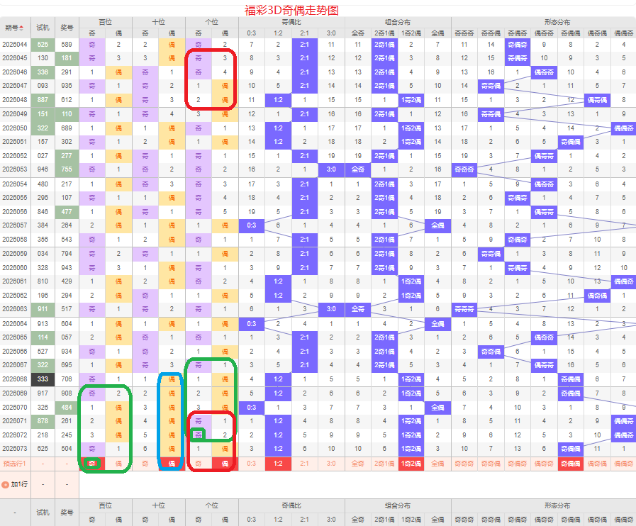 上期奇偶比是1:2,两偶的号码组合方式,从近五期的奇偶数出现情况看,奇数出现4次,偶数出现11次,奇数号码出现较少,本期侧重两偶的号码组合,侧重奇偶偶或奇奇偶的号码组合方式,根据奇偶形态做五码定位13579/02468/02468或13579/13579/02468