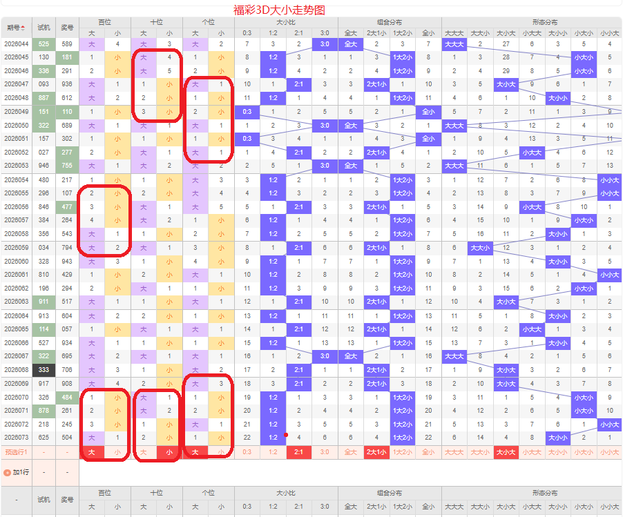 上期大小比为1:2,两小的号码组合方式,从近五期出现情况看,大号码出现6次,小号码出现9次,大号码出现较少,本期侧重两大的号码组合,本期百位侧重大号码,十位侧重小号码,个位要侧重看大,侧重大小大或者小大小的号码组合,根据大小做五码定位56789/01234/56789或01234/56789/01234