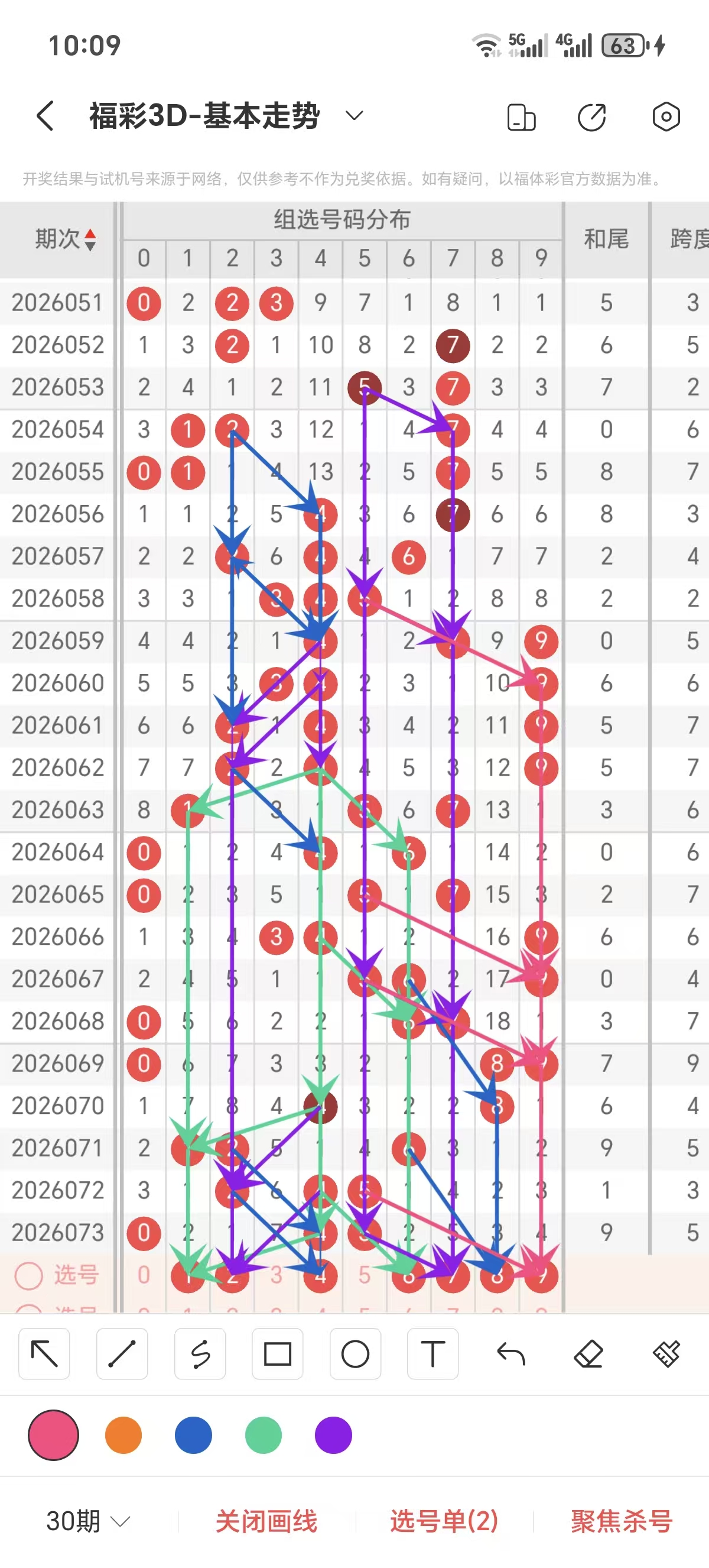 跨度通常情况下在五期之内重复一个跨度的概率很高,近五期重复了5的跨度,近五期跨度为9/4/5/3/5,近期02路的跨度较热,上期是2路的跨度,本期要侧重跨度以3/5/8跨为主的号码组合。可以从跨度方面选择相应的双胆码组合,双胆码的选取要根据近期和历史的走势进一步的分析选取。