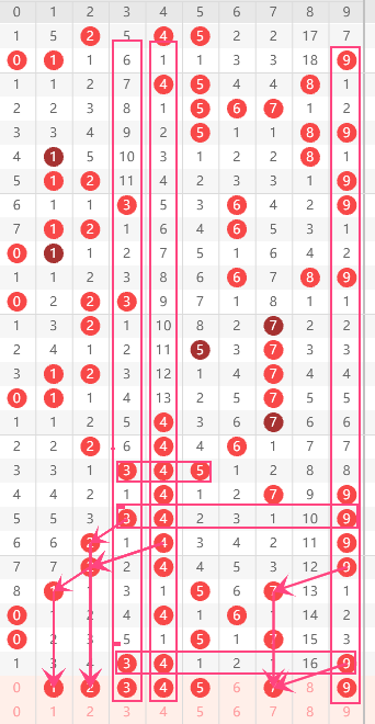 结合近10期开奖结果分析,号码:4-9出现了5次以上,表现较为活跃,根据热码继续走热的特性,可将它们列为热号重点,本期可以关注继续出球。再结合组选走势图分析值得重点关注!综合以上冷热码走势:1-2-3-4-5-7-9
