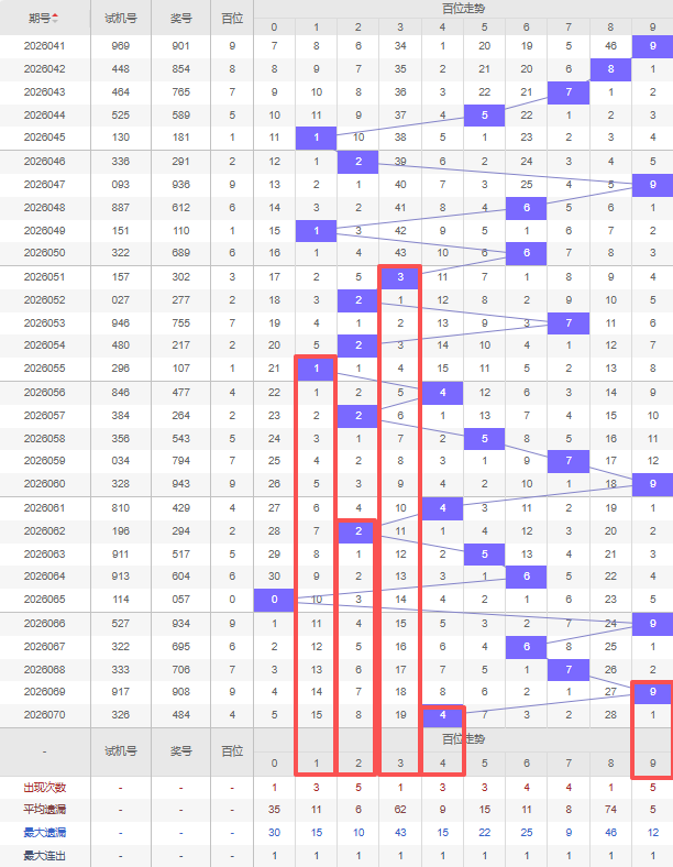 上期百位:4,近10期百位出号:9 4 2 5 6 0 9 6 7 9 4。最近10期大小变化分别:小小大大小大大大大小,奇偶变化分别:偶偶奇偶偶奇偶奇奇偶,质合变化分别:合质质合合合合质合合,根据近10期的出号规律本期综上所述百位出号推荐5个号码:1 2 3 4 9。