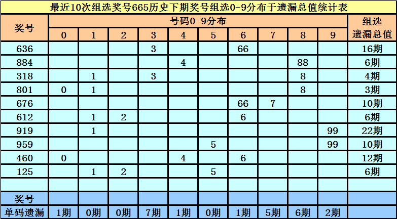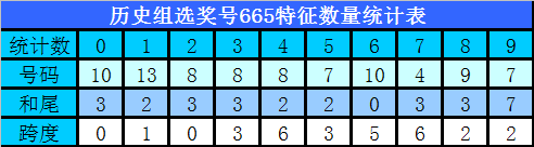 组选665开出之后,其下期和尾9出现次数最多,为7次,和尾6出现次数最少,为0次,本期防冷码和尾轮空。