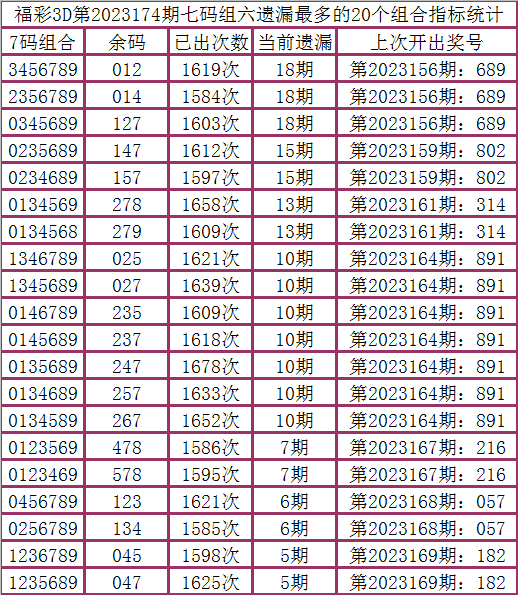 2023173期奖号组选类型为组六,20个最大遗漏的7码组六开出6个;