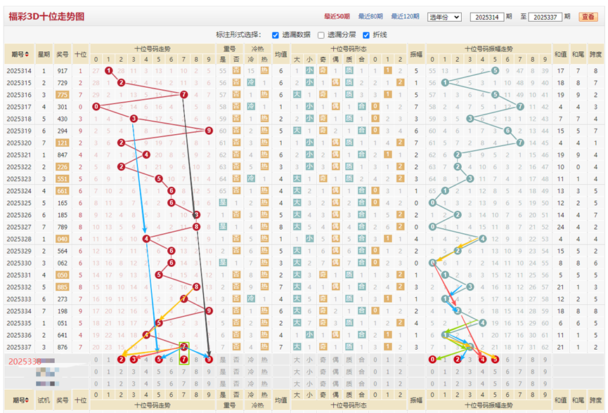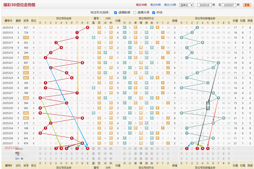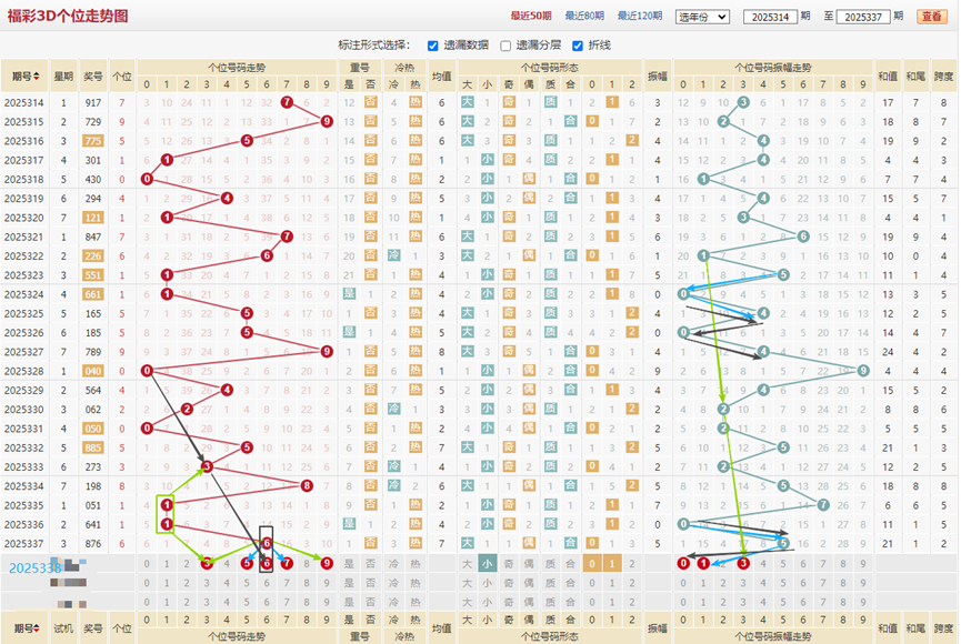 十位近期走势:5/6/6/8/8/4/6/6/5/8/7/9/5/4/7,偶数占优开出9期,奇数急需回补继续本期重点,见上图振幅红色线0/2/4等隔开出对应数字3,蓼色线4/2/0和1/3/5等隔下来对应数字2,绿色线4/1和3/0等隔下来对应数字7,左边蓝色线3/4/5,黑色线7/8/9,黄色线8/5/2,综上图十位推荐:23457