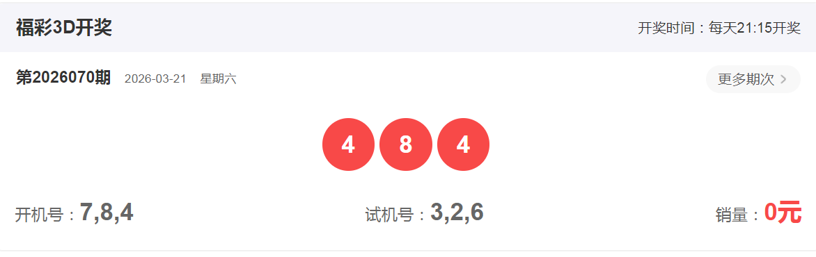 福彩3D2026年3月21日第071期开奖号码是484,组三形态,跨度4,和值16,偶偶偶