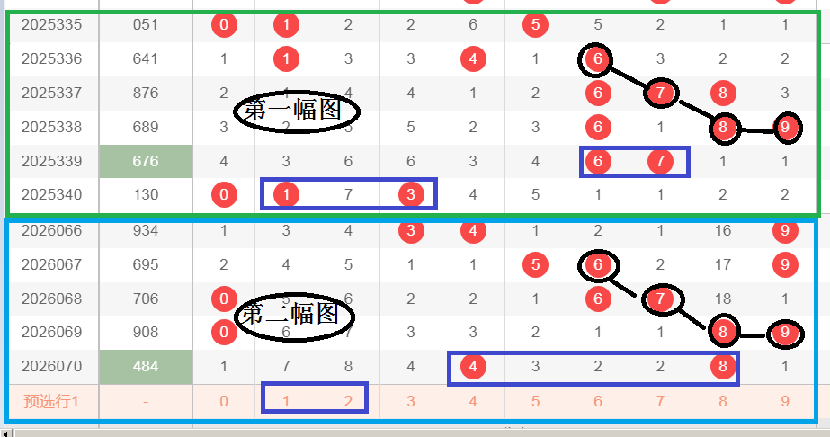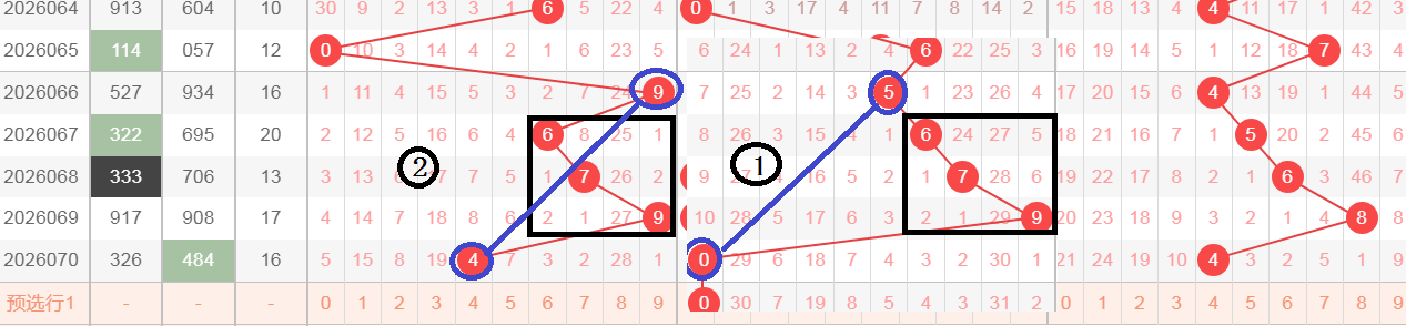 近期没有太好的走势分析,所以没有和大家分析走势,在这里说声抱歉,这是一张小盘走势分析图,为了方便和大家分析,我把两张走势分析图叠加起来,分成第一次和第二次,在第一幅图中开出了黑颜色顺子6789,在第二幅图中同样也开出了黑颜色6789,在第一幅图中黑颜色6789的下期开出了组三676,全大的组三,百位和个位是对子,在第二幅图中黑颜色6789的下期开出了484,也是组三形态,百位和个位也是对子,在第一幅图中蓝颜色框6和7相加等于13,在下期就开出了13的组合,那么轮到今天,蓝颜色框4和8相加会不会开出12的组合,文字表达不太清楚,大家可以观看上面的视频